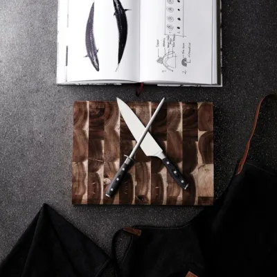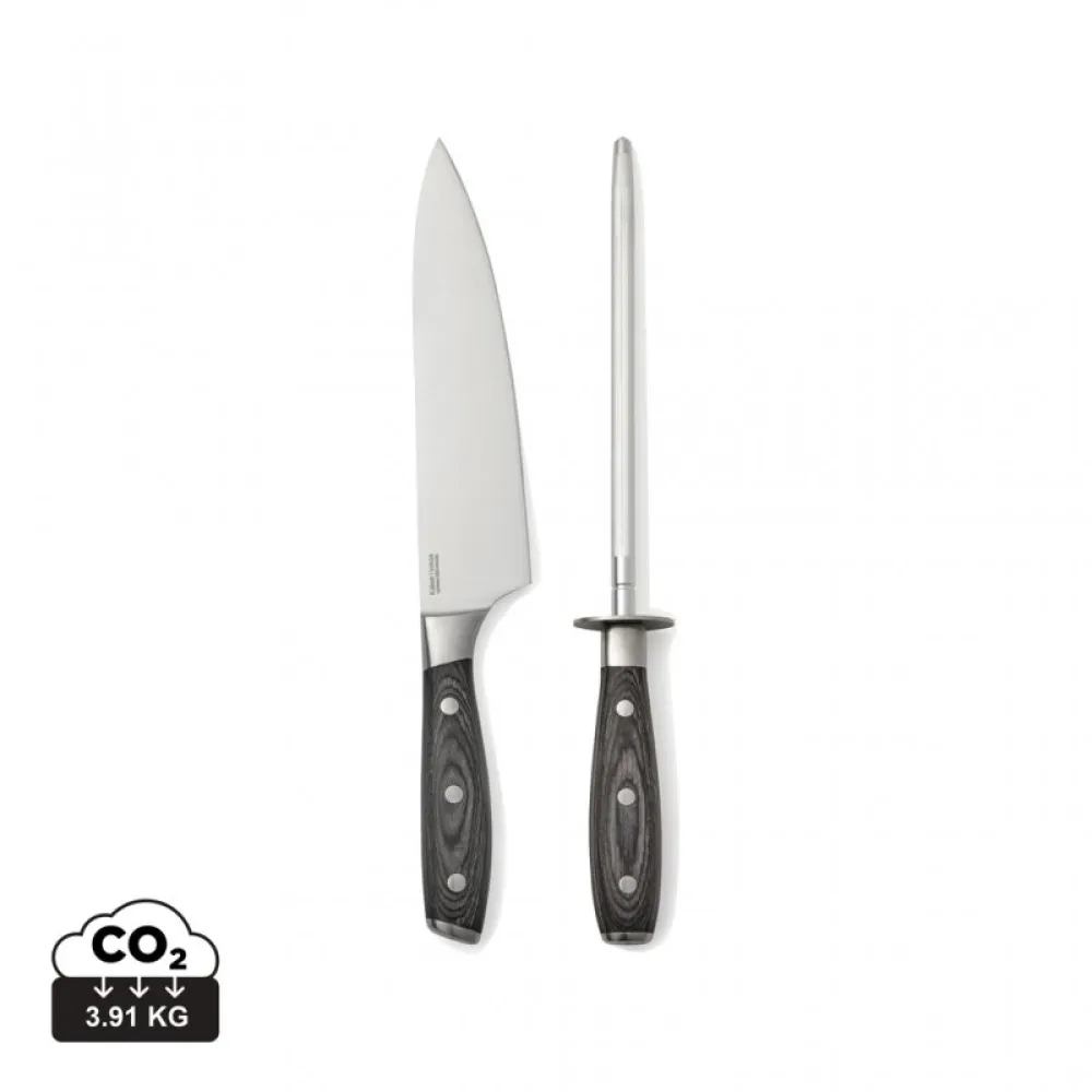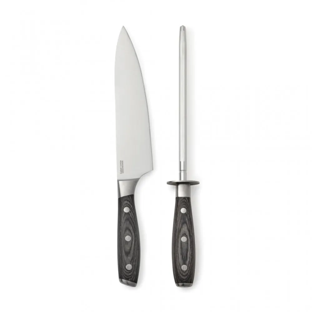 The inherent properties of the German steel make the blade stain resistant and requiring no more care than occasional sharpening. Chef’s knife: 20 cm blade. Honing steel: 33 cm.