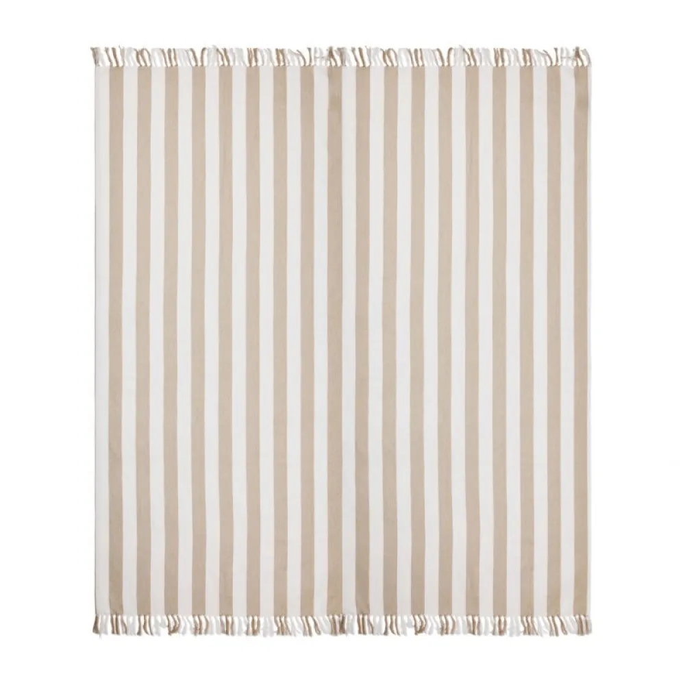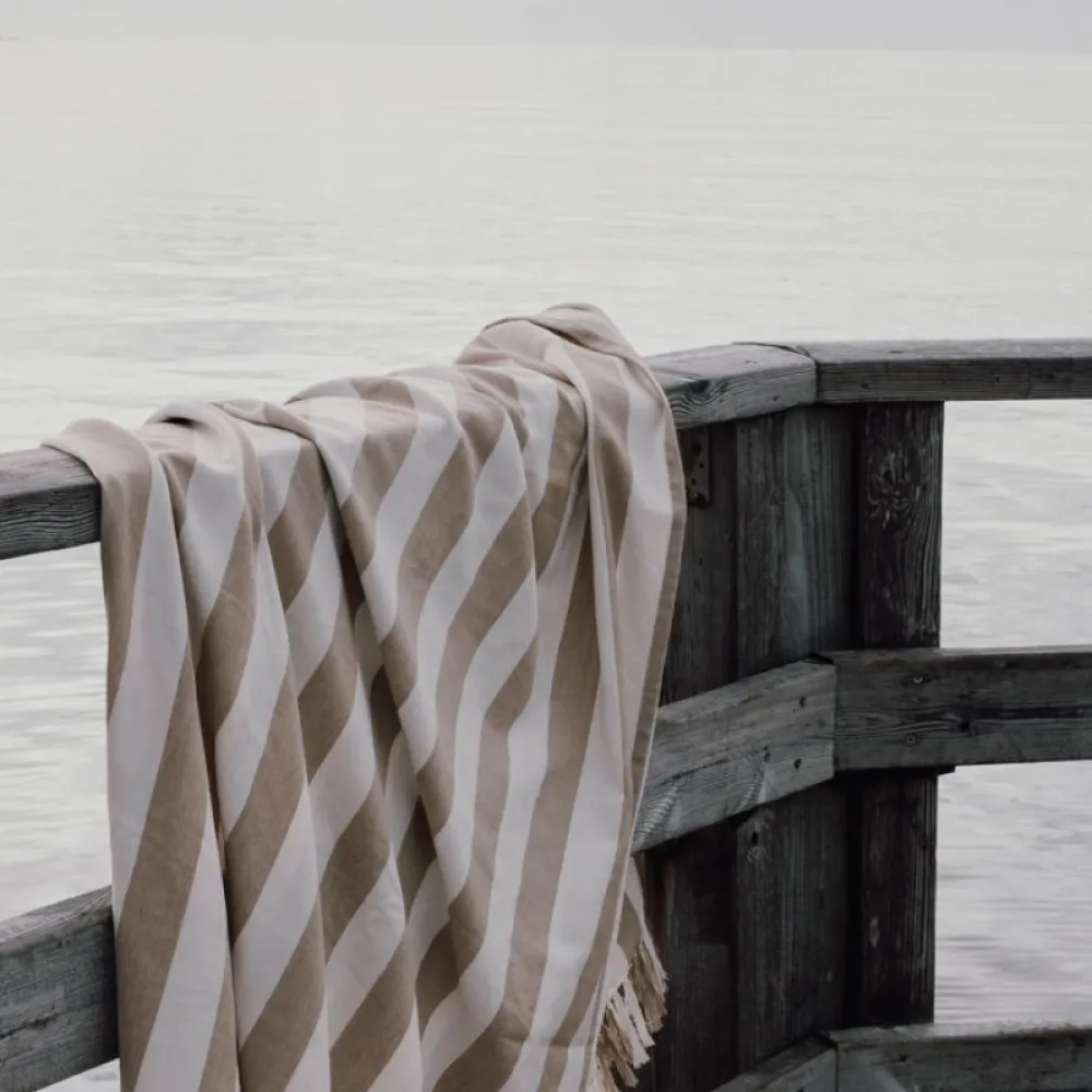 This family hammam beach towel features a classic two-colored striped pattern with fringes on the short sides. With its generous 180×180 cm, it’s perfect for sharing with loved ones, whether you’re relaxing at the beach or lounging by the pool. Crafted from a lightweight and airy 200 gsm blend, it combines the comfort of cotton with the quick-drying benefits of polyester. Certified by GRS (Global Recycled Standard), GRS certification guarantees that the entire supply chain of the recycled materials is certified.