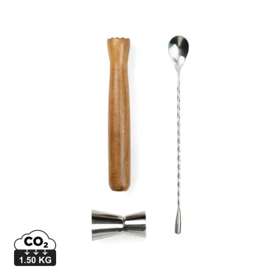 This set includes a wooden muddler in FSC®certified acacia, a stainless steel jigger, and a swirled bar spoon, all designed to help you craft the perfect drink.