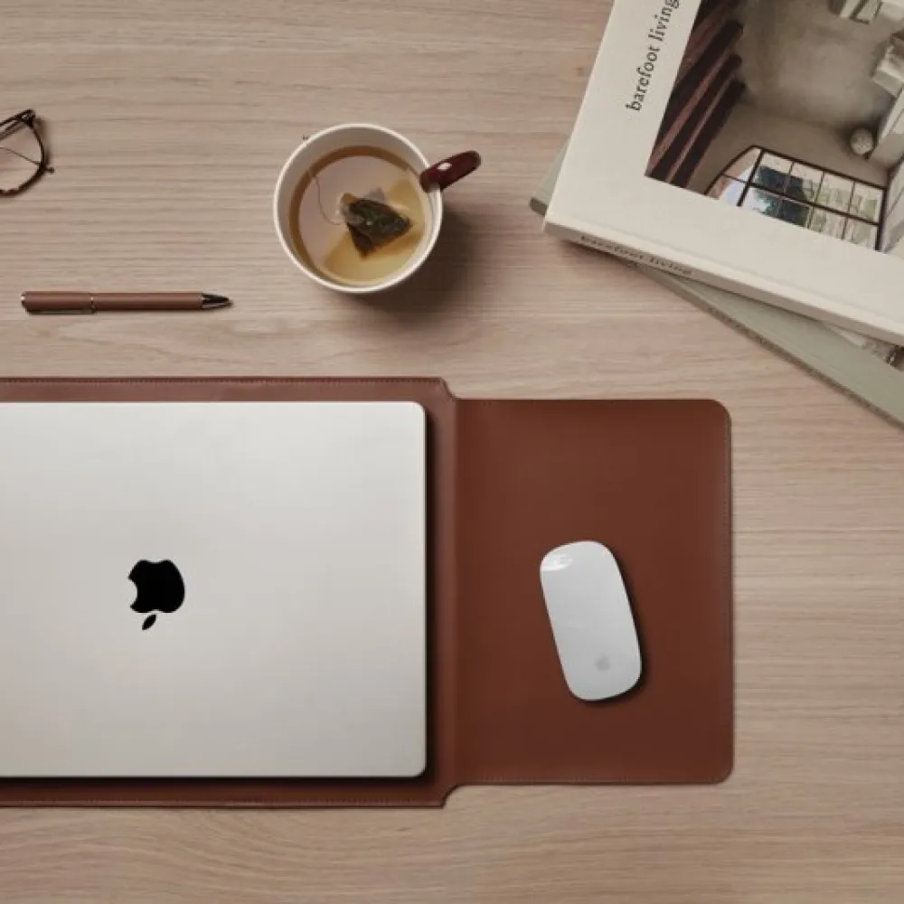 This sleek sleeve boasts a smart flap closure, doubling as a convenient mouse pad when open. Its detailed stitching adds an extra touch of sophistication.