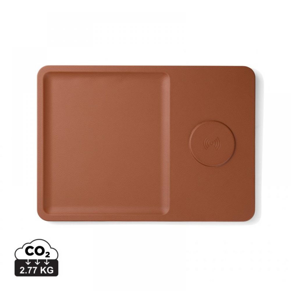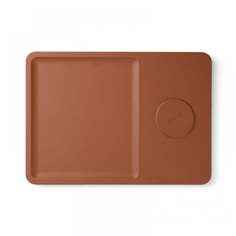 The tray features an integrated wireless charging pad for your phone.