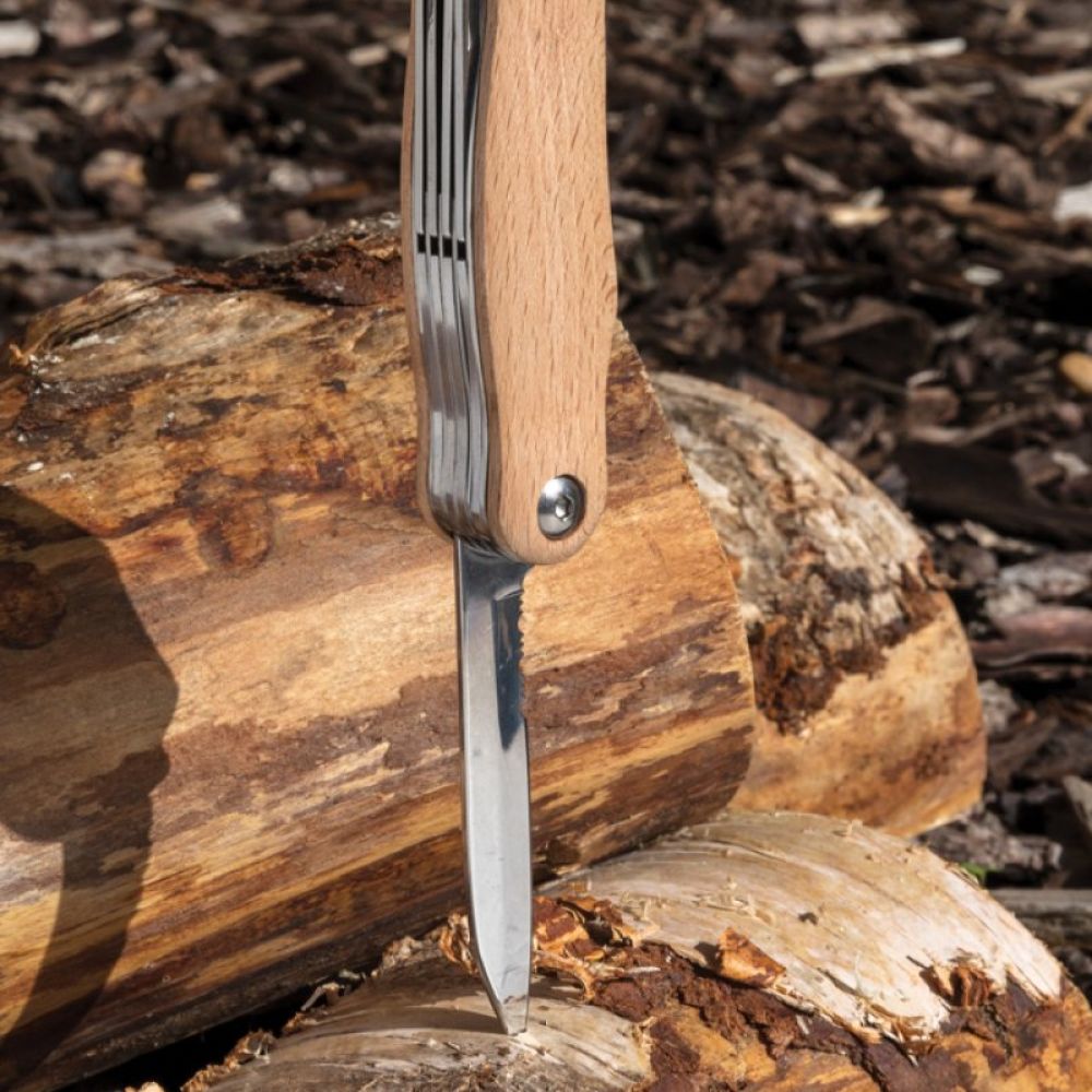 Compact and strong pocket knife with 9 functions. With beech wood case and high quality stainless steel tools.