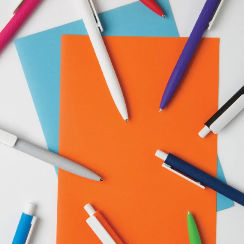 The pen is made with 83% recycled ABS, certified for sustainability.